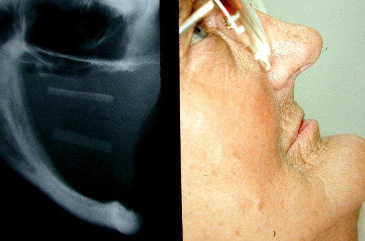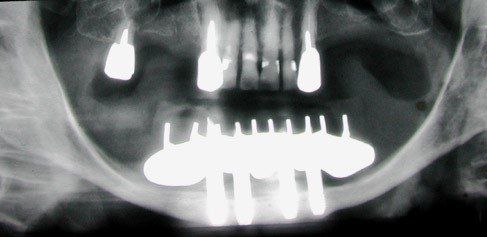 Un caso esemplificativo è il seguente: nel 2001 una paziente di circa sessanta anni giunse alla nostra osservazione chiedendo una riabilitazione protesica possibilmente fissa di entrambe le arcate. L’aspetto clinico mostrava una evidente sofferenza dei tessuti perilabiali espressione del grave stato di disagio sofferto dalla paziente nell’indossare due protesi totali. L’esame ortopantomografico “la panoramica” confermò la situazione clinica rivelando la presenza di residui dentali inutilizzabili protesicamente. Venne raccolta una TAC Dental scan la quale mostrò una grave atrofia ossea di entambi i mascellari ascrivibile alla quarta classe di Cawood e Howel. La particolare conformazione della mandibola, con notevoli cavità linguali, complicò ulteriormente le condizioni di trattamento chirurgico.