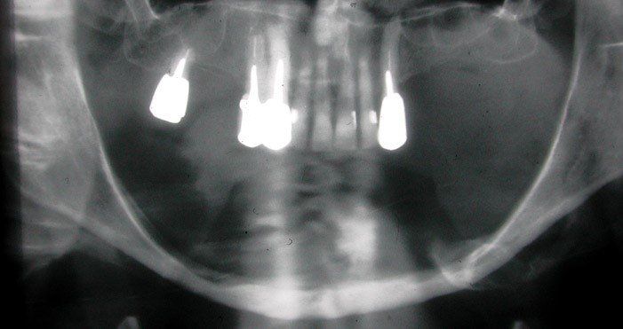 L’inserimento attento di cinque impianti nell’area del mento consenti di risolvere l’edentulia inferiore con una protesi fissa tipo Toronto Bridge. L’arcata superiore venne riabilitata con una protesi totale rimovibile.