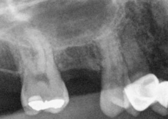 La panoramica dimostra l’esiguità del triangolo retrocanino che non può pertanto essere utilizzato per l’inserimento di due impianti. L’area posteriore rivela un’atrofia ossea pronunciata che richiede un rialzo di seno con innesto di osso del paziente (autologo) che verrà prelevato dal ramo mandibolare